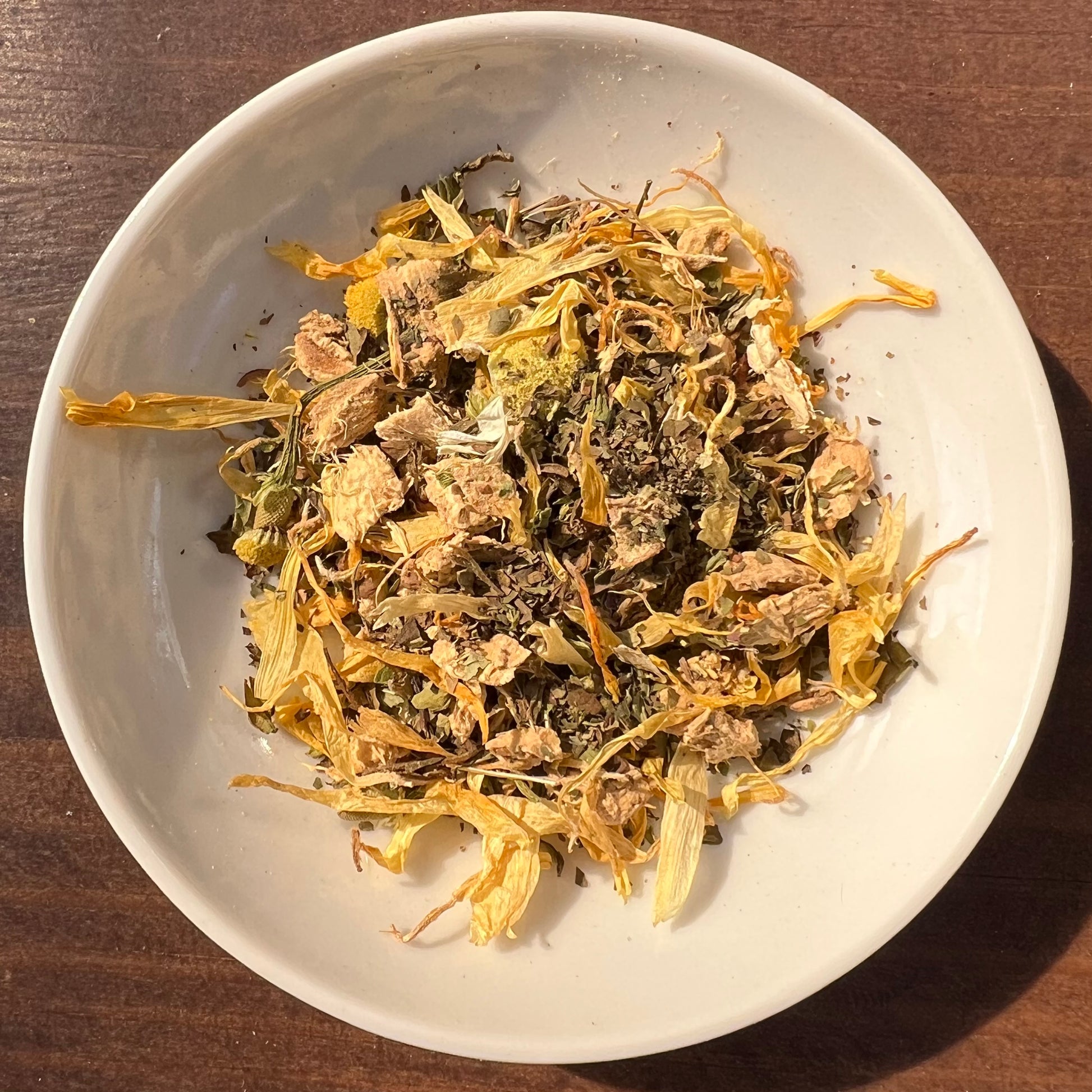 Ingredients: Spearmint (Mentha spicata), Ginger Root (Zingiber officinale), Chamomile (Matricaria chamomilla), Calendula (calendula officinalis)